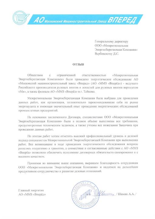 Услуга: энергетическое обследование Московского машиностроительного завода «Вперёд» и филиала ОАО ММЗ «Вперёд» в г. Тейково.