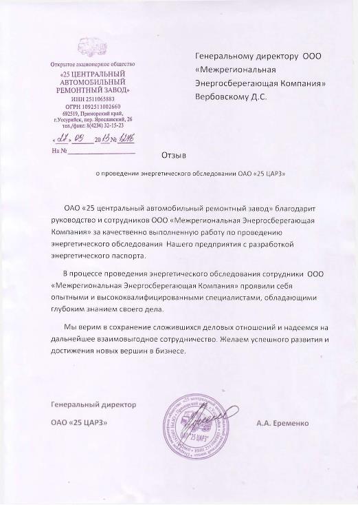 Наименование клиента: ОАО «25 центральный автомобильный ремонтный завод».