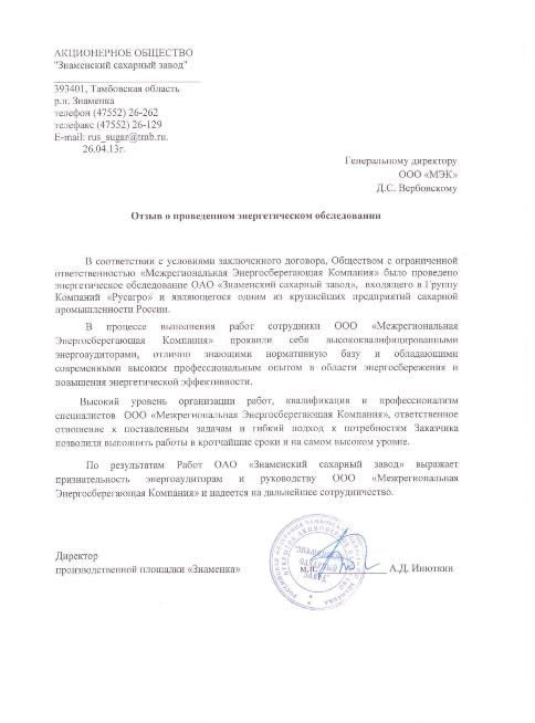 Услуга: энергетическое обследование Знаменского сахарного завода, Сахарного завода Жердевский и Сахарного Завода Никифоровский.