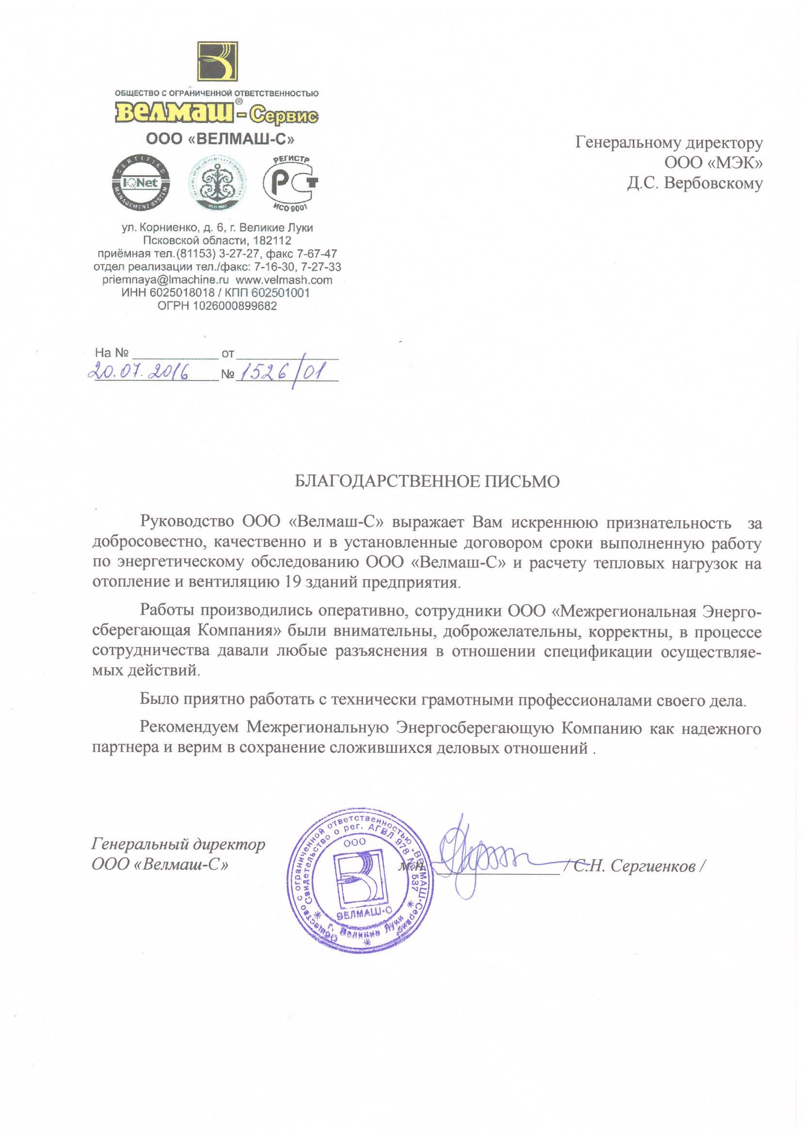 Наименование клиента: «Великолукский машиностроительный завод» - ООО «Велмаш-С».